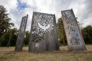 The Enfield Living Memorial comprises a heart-shaped ring of trees surrounding a metal artwork at its centre