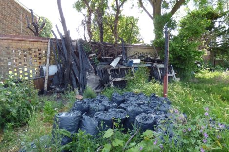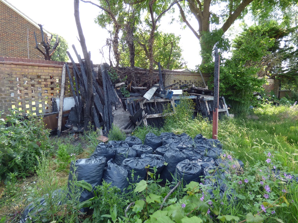 Last August, London Fire Brigade was called to a fire in Barrowfield Close which started on the allotment site and then spread to a neighbouring garden. The charred remains of a structure remain there, alongside a huge fly-tip of rubbish. Scattered throughout the site are numerous flammable materials.