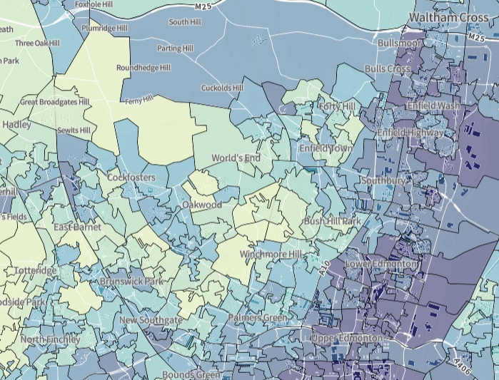 The borough is, in the words of the council, a “divided borough”, with some areas in the west such as Winchmore Hill and Oakwood ranking in the 5% of least deprived neighbourhoods, while the vast majority of local areas struggling with deprivation issues are concentrated in the east, exposing a fault line of inequality.