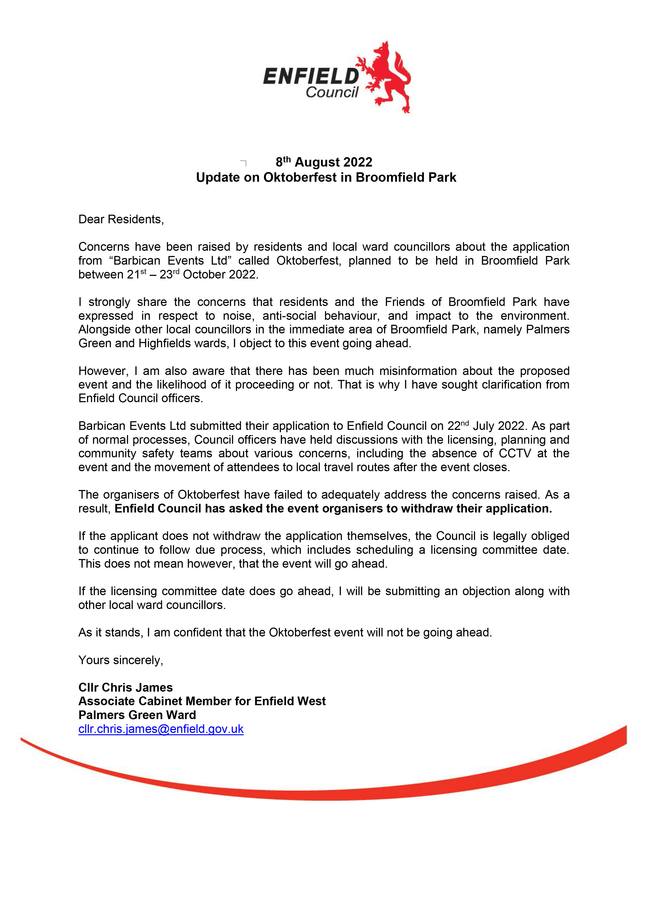 Cllr James said that because of the local concerns the council itself had written to events company Barbican Events Limited to urge the organiser to withdraw its bid to host London Oktoberfest at Broomfield Park.