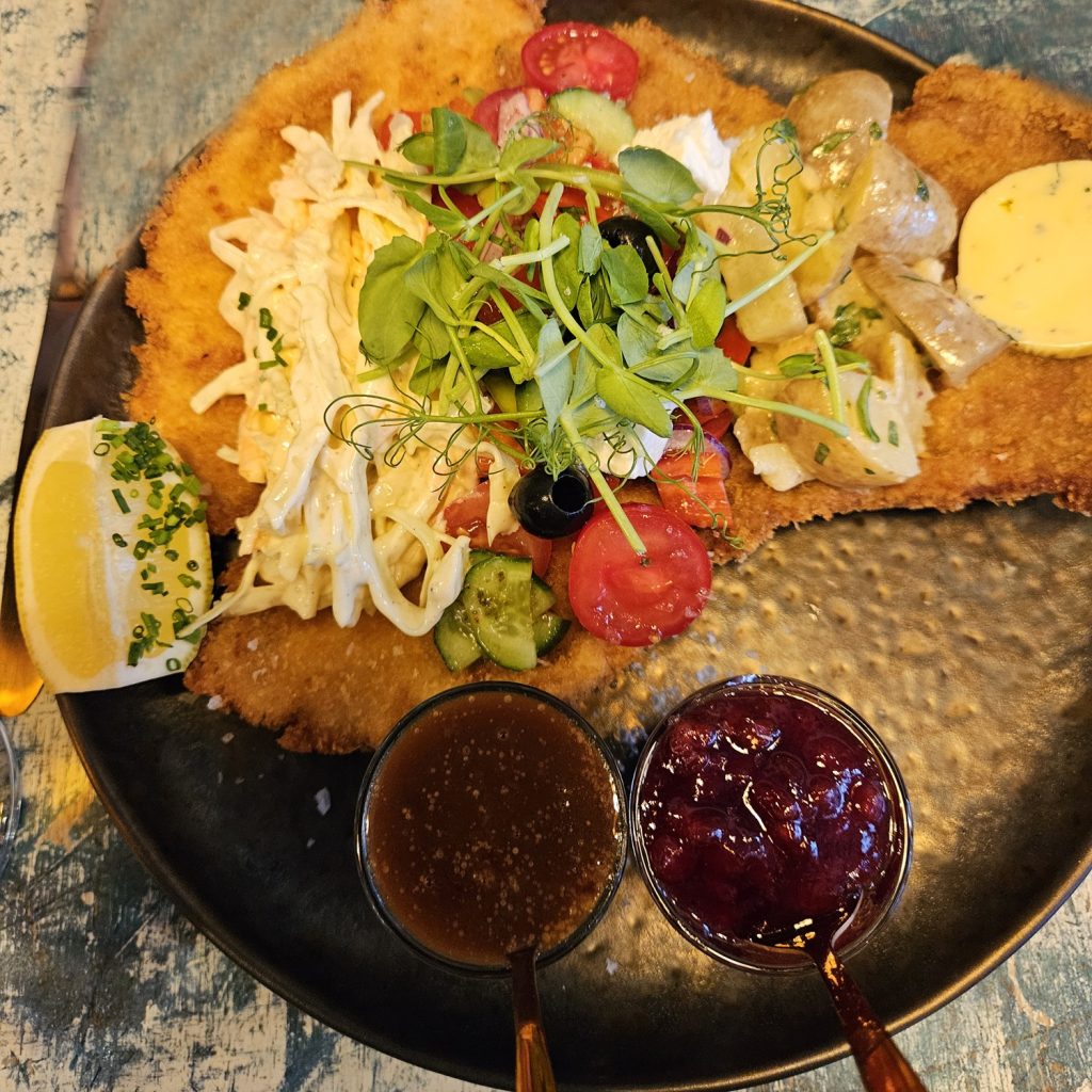 The menu isn’t overlong, with starters including Austrian-style potato salad, arancini (rice balls with mushroom and cheese filling), and calamari. But the stand-out is the main course offer, with 13 varieties of schnitzel, plus two more served in a burger bun. Portions are big and I recommend sharing a starter!
